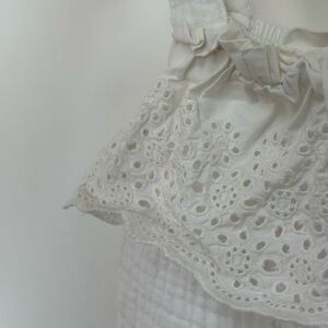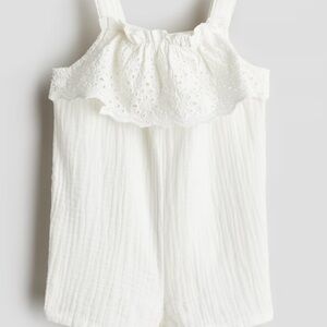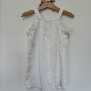 Adorable cream romper with ruffled details. Perfect for a stylish baby look! Smallest imperfection at the front, but barely can tell you most likely can remove it! So cozy and made of muslin cotton