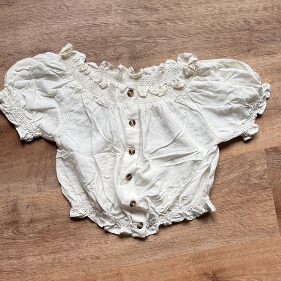 Chic cream blouse with ruffled neckline. Features button-up front and short sleeves. Ideal for versatile styling.