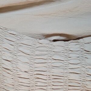 This cream blouse from H&M features a charming smocked texture and a classic Peter Pan collar, adding a touch of vintage elegance. The full-length sleeves with gathered cuffs enhance its romantic style, making it a versatile addition to any wardrobe.