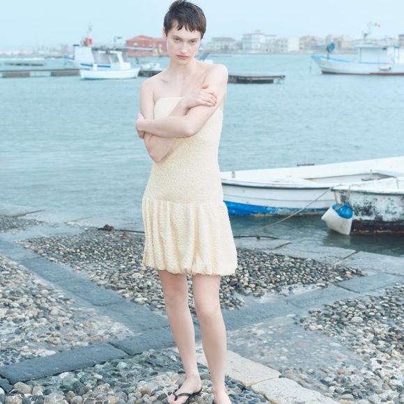 Elegant strapless dress. Textured fabric. Perfect for summer outings.