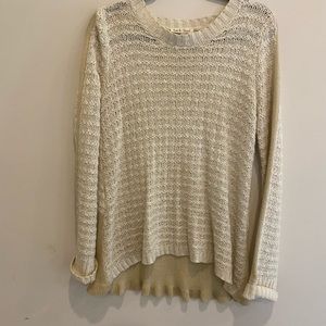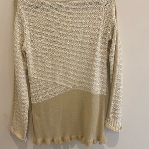 Beautiful cream sweater with added piece of taupe color for contrast. This is great with skinny jeans or leggings. Worn only a few times. This sweater is an attention getter and very unique.