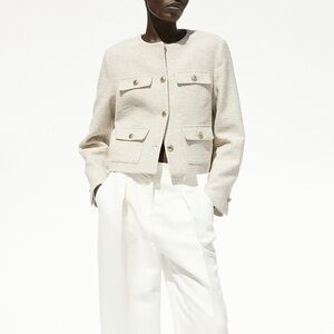 Elegant cream jacket with textured fabric. Features gold buttons and multiple pockets. Perfect for a chic look. Reposhing as it did not fit but is super cute.