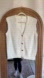 Stylish cream sweater vest with a V-neck and button-up front. Ideal for layering. Soft and comfortable fabric.