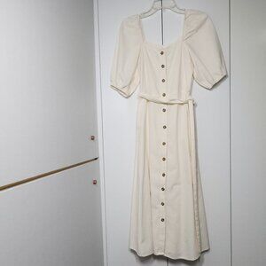 Calf-length dress in woven, creped cotton fabric. Square neckline, buttons full length of front and short puff sleeves with elastic over shoulders and at cuffs. Seam and removable tie belt at waist. A-line skirt. Unlined