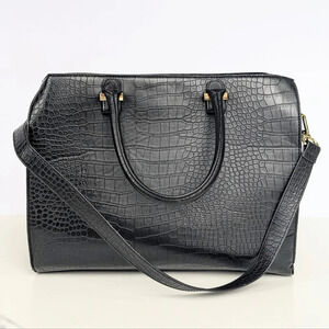 H&M faux leather croc embossed, top handle black tote with gold accent hardware/feet, crossbody strap, 2 inside pockets, side snaps to condens sides and zip closure top. 100% Polyester Lining/100% Polyurethane Shell. Gently Loved. Great Condition! Clean Inside. Slight wear on feet & small split at fold of side snaps (see pics). Measures approx: 16" x 12" x 6 3/4"