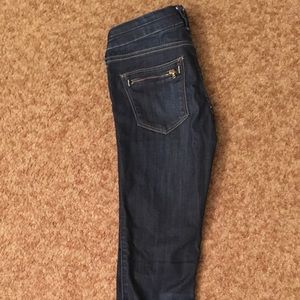 Size 27/32(in.). Worn 2-3 times. Dark wash w/ gold accepts and zippers on butt pockets.