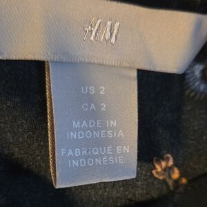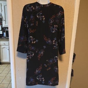Elegant dark dress with colorful floral accents. Features long sleeves for a sophisticated look.