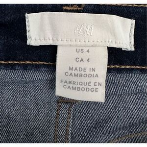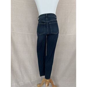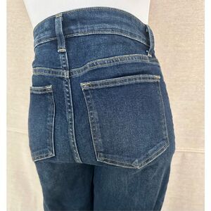 These jeans are skinny fit, and a dark wash. The back pockets are plain. They have a zipper closure, with a button.