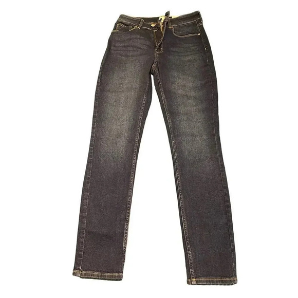 These H&M dark wash skinny jeans are designed to flatter with their slim, form-fitting silhouette. Crafted from a stretchy and durable denim blend, they provide both comfort and a sleek appearance. The classic dark wash makes them versatile for both casual wear and dressing up with a blouse or blazer. These jeans feature a traditional five-pocket design and a zip fly closure, offering a timeless style that can be worn throughout the year.