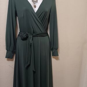Chic long sleeve dress with a wrap design. Deep green color adds elegance. Perfect for versatile styling.