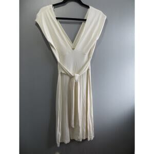 Step out in this sexy cream-colored deep v-neck sleeveless dress! Fabric is a soft rayon/spandex blend (94% / 6%). Tie Back and hits just above the knee. Fabric is a stretch to fit, especially at the waist so you never have to feel constrained.