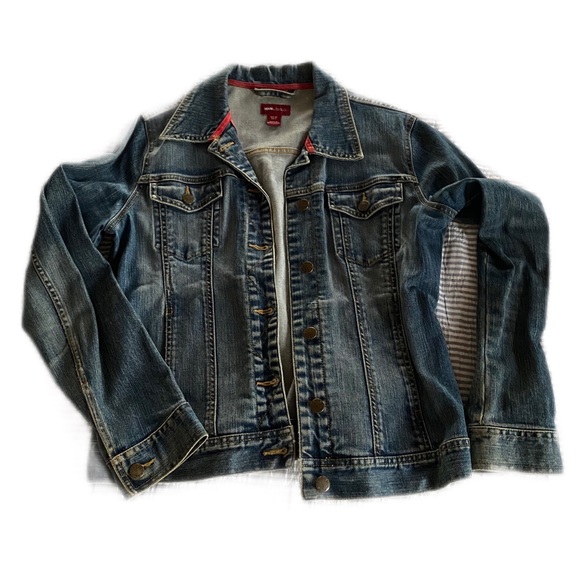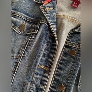 H&M dark wash denim jacket with red detailing inside, button front and slim fit; perfect go with everything denim jacket! Excellent condition. Smoke free home.