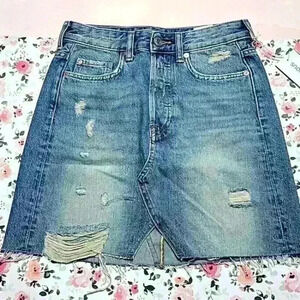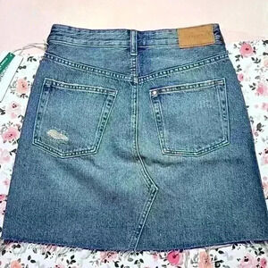 NWT H&M light to medium wash denim. Size 2. Raw hem. Skirt has a zip and button closure.