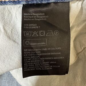 Condition: Good used condition. Features distressing on the front and back, purposeful raw frayed hem, and intentional faded areas. See photos for details on wear and distressing.