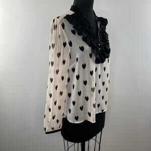 H&M Divided Beige Black Heart Ruffle Neckline Button-Down Long Sleeve Blouse M?