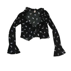 Add whimsical charm to your wardrobe with this sheer cropped black and blue butterfly print blouse by H&M Divided. Features delicate ruffle trim, a front tie closure, and dramatic bell sleeves for a feminine, Y2K-inspired look. Lightweight and airy — perfect for layering over a bralette, tank, or crop top.