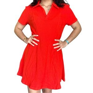 h&m vibrant reddish-orange dress with ribbed texture. features a classic collar. ideal for stylish outings.