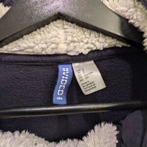 Navy fleece hoodie sweatshirt with buttons to open up the neck/hood. Size is small but fits more between a small/medium. Very well cared for, clean, smoke-free home. No flaws.