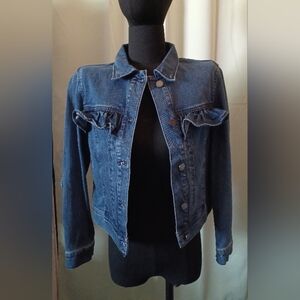 Stylish denim jacket featuring ruffle accents across front, across backside, and down backside of sleeves. Perfect for casual wear. Side slit pockets. Inside pockets. Pre-owned. See photos. They are part of the description. Measurements are approximate.