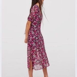 Gorgeous H&M Divided floral midi dress in a vibrant pink, magenta, and white flower print on a black background. Lightweight chiffon-style overlay with soft black lining for comfort. Flattering V-neckline, short puff sleeves with button cuffs, fitted waist, and a breezy A-line skirt with side slit for movement.