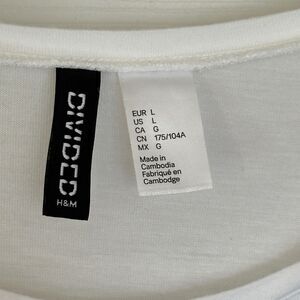 The H&M Divided Frenchie White Lightweight Long Sleeve Tee in size Large is a stylish and versatile top perfect for casual occasions or travel. Made from viscose material, this tee features a scoop neckline, pullover closure, and a regular fit. The white color and lightweight design make it easy to pair with different outfits, while the long sleeves add an extra layer of comfort. With its Frenchie and Paris theme, this tee is a must-have for women looking for a chic and trendy addition to their wardrobe.