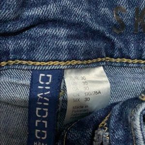Men’s 32 Blue Skinny Distressed Jean With Paint Splatter And Zipper Bottoms. 99% Cotton 1% Elastic