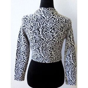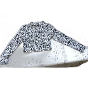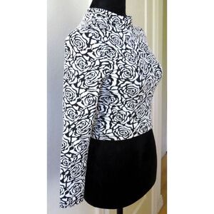 Cute crop top has a mock turtle neck and long sleeves. Black and white knit floral rose pattern. 56% cotton 40% polyester 2% rayon 2% elastane, machine wash. Approx measurements laid flat: length 14.5" sleeves 20" chest (p2p) 14.5". No signs of wear.