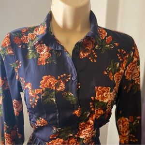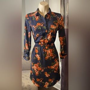 H&M Divided Navy Blue Orange Floral Shirtdress Size 2 (XS.) Excellent preowned condition. Satiny fabrication. Elasticized waist. Functional button placket front closure.