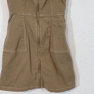 Short, gently fitted bib overall dress in woven fabric. Buttons at front, wide, adjustable shoulder straps, and a seam at waist.
