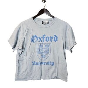 This is a fun and comfortable graphic T-shirt from H&M's Divided collection. The shirt is a light blue color and features a classic college-style graphic with "Oxford" and "University" on the front. It has a classic crew neck and a relaxed fit, perfect for a casual, comfortable look.