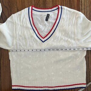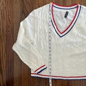 H&M Divided Preppy Cream Blue Red Varsity Sweater Stripe V Neck Long Sleeve