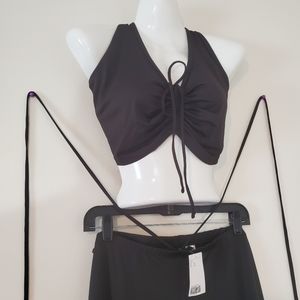 Great look for many occasions. Top and bottoms are extremely stretchy and flexible. Tie up the pants in many different ways. Top is halter neck and ties up front.