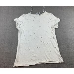 H&M Divided women’s short sleeve graphic t-shirt featuring a bold skull and snake print with “Ransom” lettering. Designed with intentional distressing and holes for a vintage, edgy look. White/cream base with black graphic print.