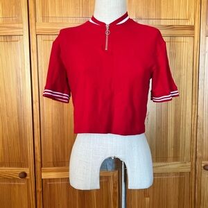 This H&M Divided size small crop top is a bold red statement piece made from 100% cotton, ensuring comfort and breathability. It features a sporty design with a three-quarter zip detail at the front, allowing you to adjust the neckline to your preference. The top is accented with varsity-inspired white and black stripes on the collar and sleeves, adding a trendy athletic touch.