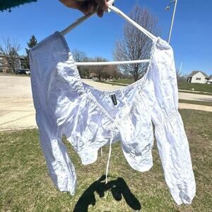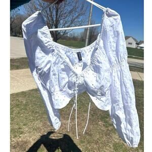 H&M‎ Divided White Eyelet Tie Front Long Sleeve Balloon Top Size XL Blouse