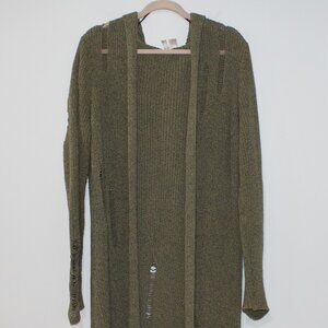 Gently used condition for display purposes. Factory distressed with no buttons (open cardigan). No additional rips, tears, holes, stains, or odors. Please see pictures. Coming from a smoke free home.