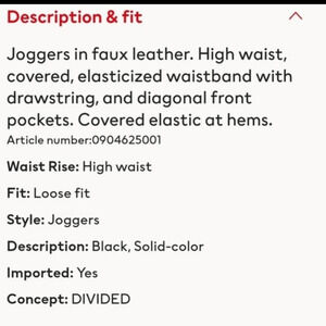 H&M Divided high rise elastic waist faux leather black jogger draw string size 8
