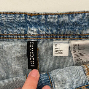 Women’s H&M Divided miniskirt. Skirt is light wash denim material. Has full front button. In good condition, but has slight wear as shown in images. Size 2. Smoke free home!