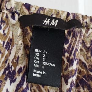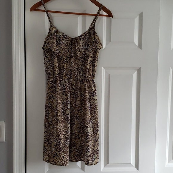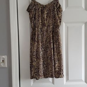 Cute print spaghetti strap dress with split flounce at neckline and elastic at waist. Peint is shades of taupes, purple and green
