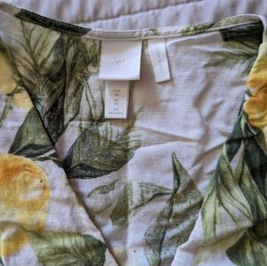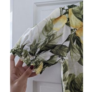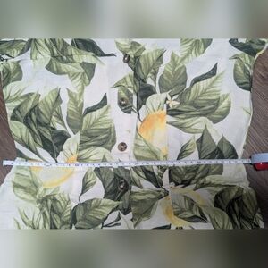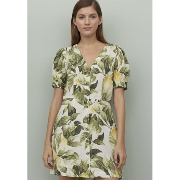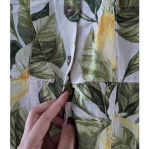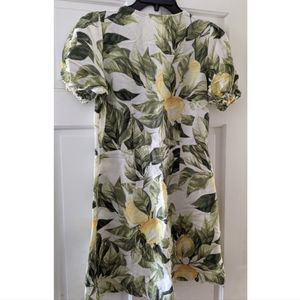 Button up summer dress, size around a U.S 6-8 or small to medium. The material is linen and very breathable. Lovely puff sleeves with a small clasp in the middle for an extra secure fit.