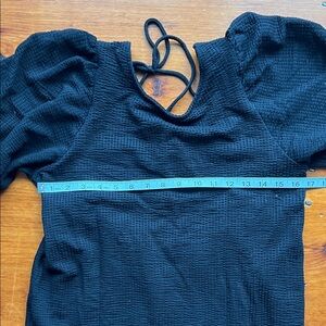 Calf-length dress in waffled jersey made from a cotton blend. Low-cut back with horizontal ties and wide, elbow-length sleeves with narrow, covered elastic.