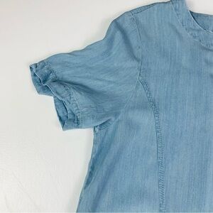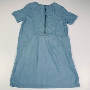 The dress is light blue, short-sleeved, and appears to be an A-line or shift style,