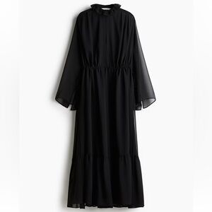 Maxi dress in sheer, woven fabric. Ruffled collar, V-shaped opening at front with concealed hook-and-eye fasteners, and long sleeves with a slit at cuffs. Drawstring at waist with extra-narrow ties and a gathered seam above hem for added volume. Unlined.