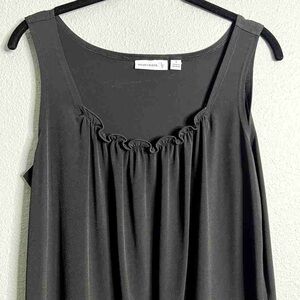 Chic black tank with subtle ruffle accent. Ideal for any occasion.