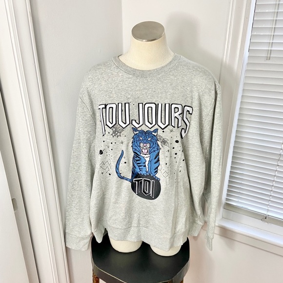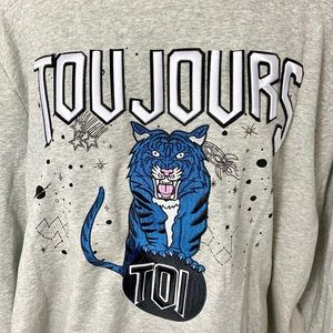 This cozy crewneck sweatshirt is spiced up with a blue tiger embroidered on the front. New.