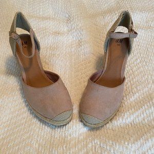 This espadrille wedge is dusty pink and made of suede material. It has a 3-inch wedge with a 1/2 inch platform and ankle strap. These shoes have never been worn.
