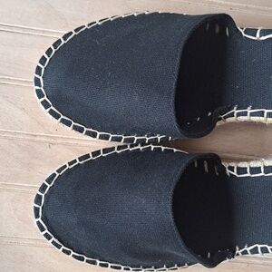 •Black canvas upper, an adjustable ankle strap with a metal buckle, and a braided jute trim around the wedge sole.