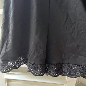 Romper in jersey. Upper section and hems with eyelet embroidered, scallop-edged flounces in woven cotton fabric. Square neckline, elasticized seam at waist, and diagonal side pockets. Unlined. Never worn