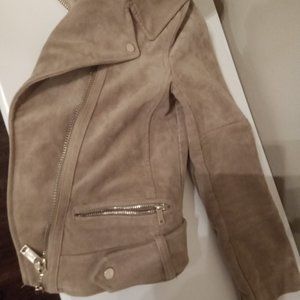Great pre-owned condition! Biker jacket in soft faux suede. Diagonal zipper at front, notched lapels with snap fasteners, and long sleeves with zipper at cuffs. Diagonal chest pocket with zipper, side pocket with zipper, small coin pocket with flap and snap fastener, and an inner pocket. Lining in satin made from recycled polyester. Please note the black marking on sleeve and please review all photos for condition.