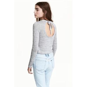 Jumper in a soft, fine, airy knit with a round cut-out section at the back and ties at the back of the neck.
